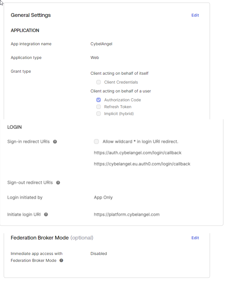 - Callback URLs: https://auth.cybelangel.com/login/callback (Platform), https://cybelangel.eu.auth0.com/login/callback (Help center)